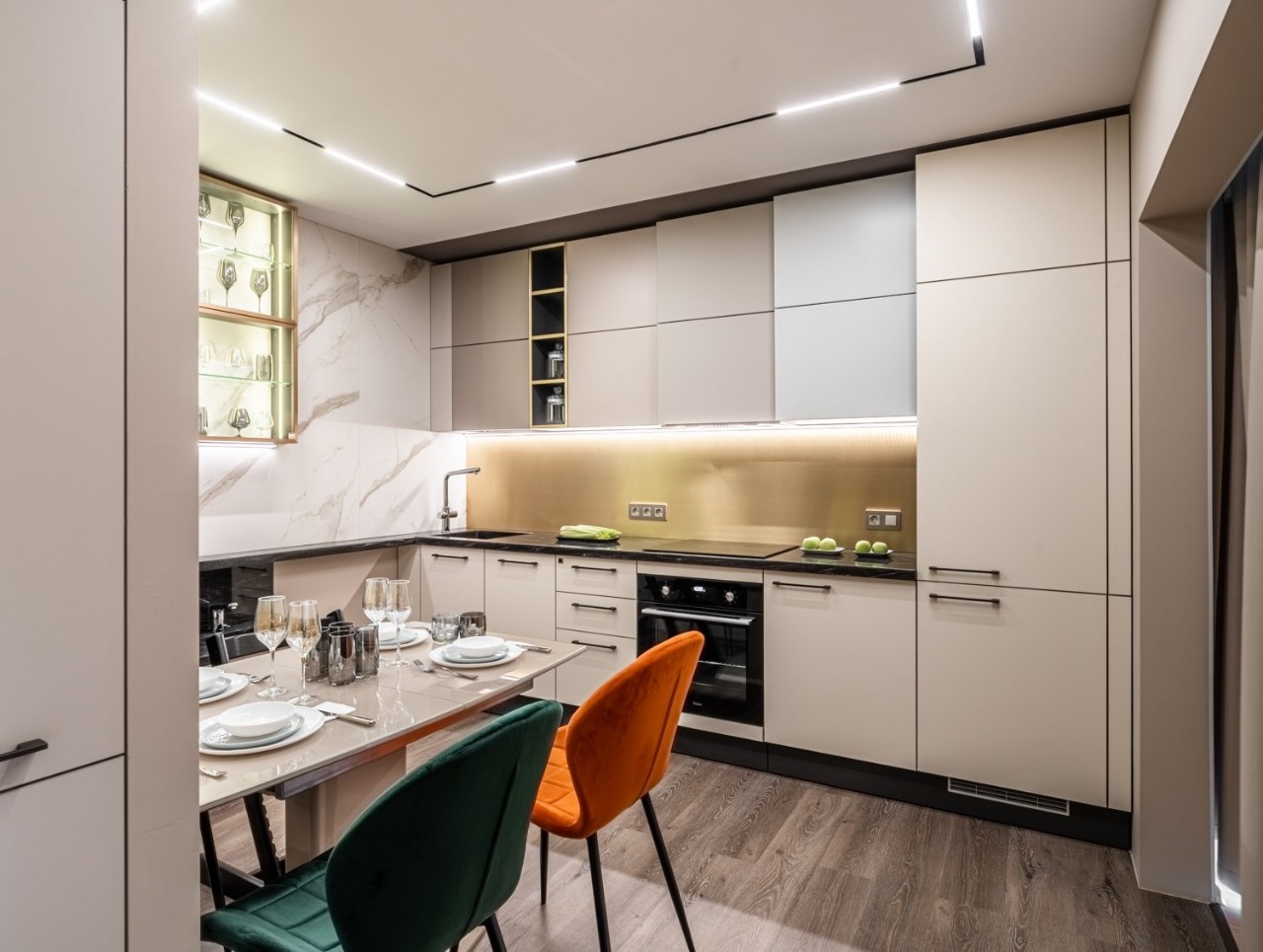 Дизайнеры использовали кварцевый ламинат Дуб Рыцарский замок 379-6 из коллекции Fargo Classic.